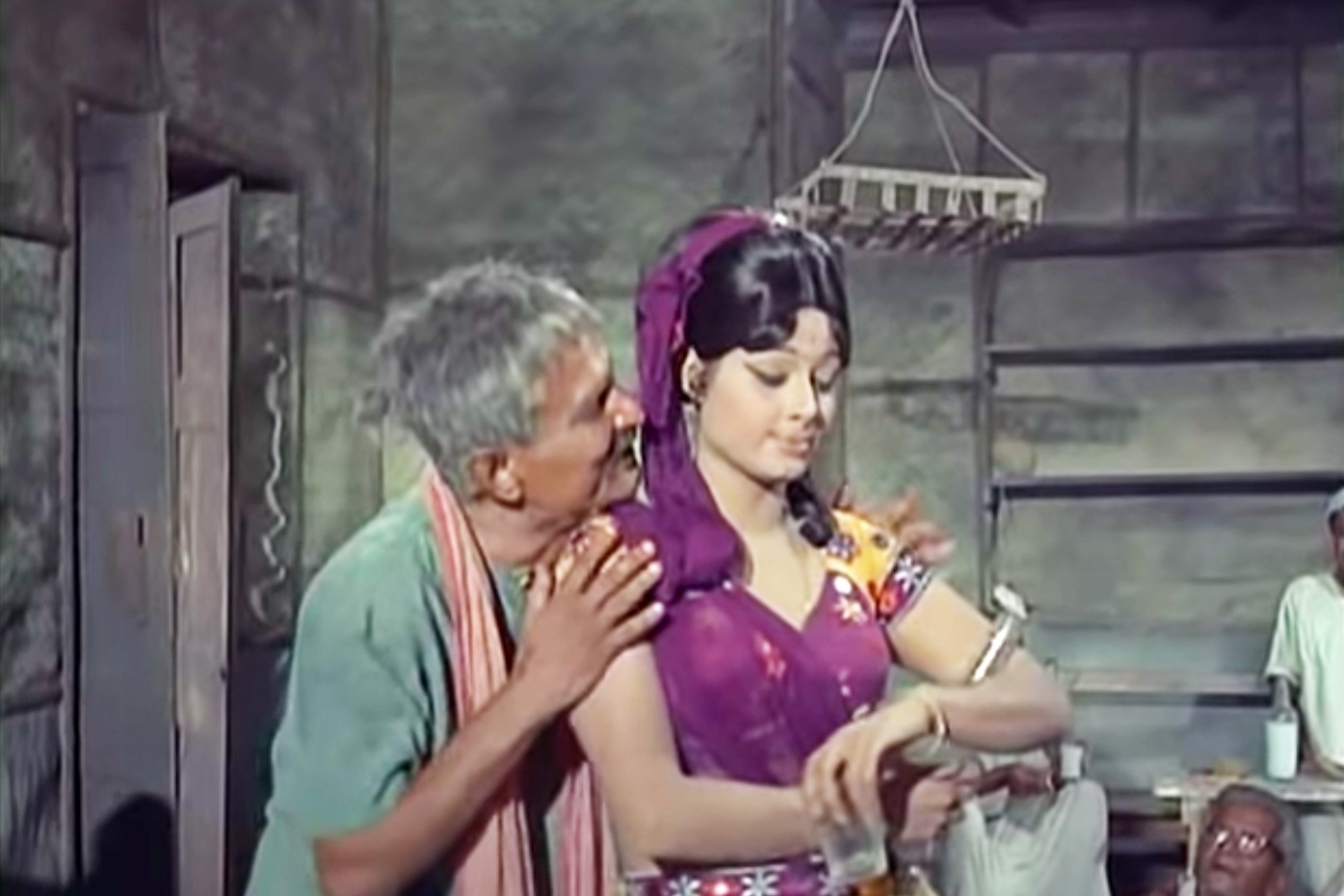 In this clip from Anokhi Ada (1973), written by Mushtaq Jalil and Rafi Ajmeri, elderly ‘Ramu Kaka’ lies (and falsely swears in the name of Dharma) to borrow money from Jeetendra, only to spend it at the local liquor shop and eve-tease young bartender ‘Radhika’, who calls him uncle.